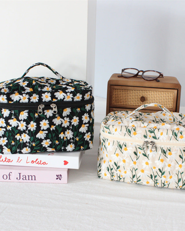 Keep your beauty essentials organized in style with this embroidered daisy cosmetic case. Featuring delicate floral embroidery and a soft fabric design, this charming pouch adds a sweet, feminine touch to your everyday routine.