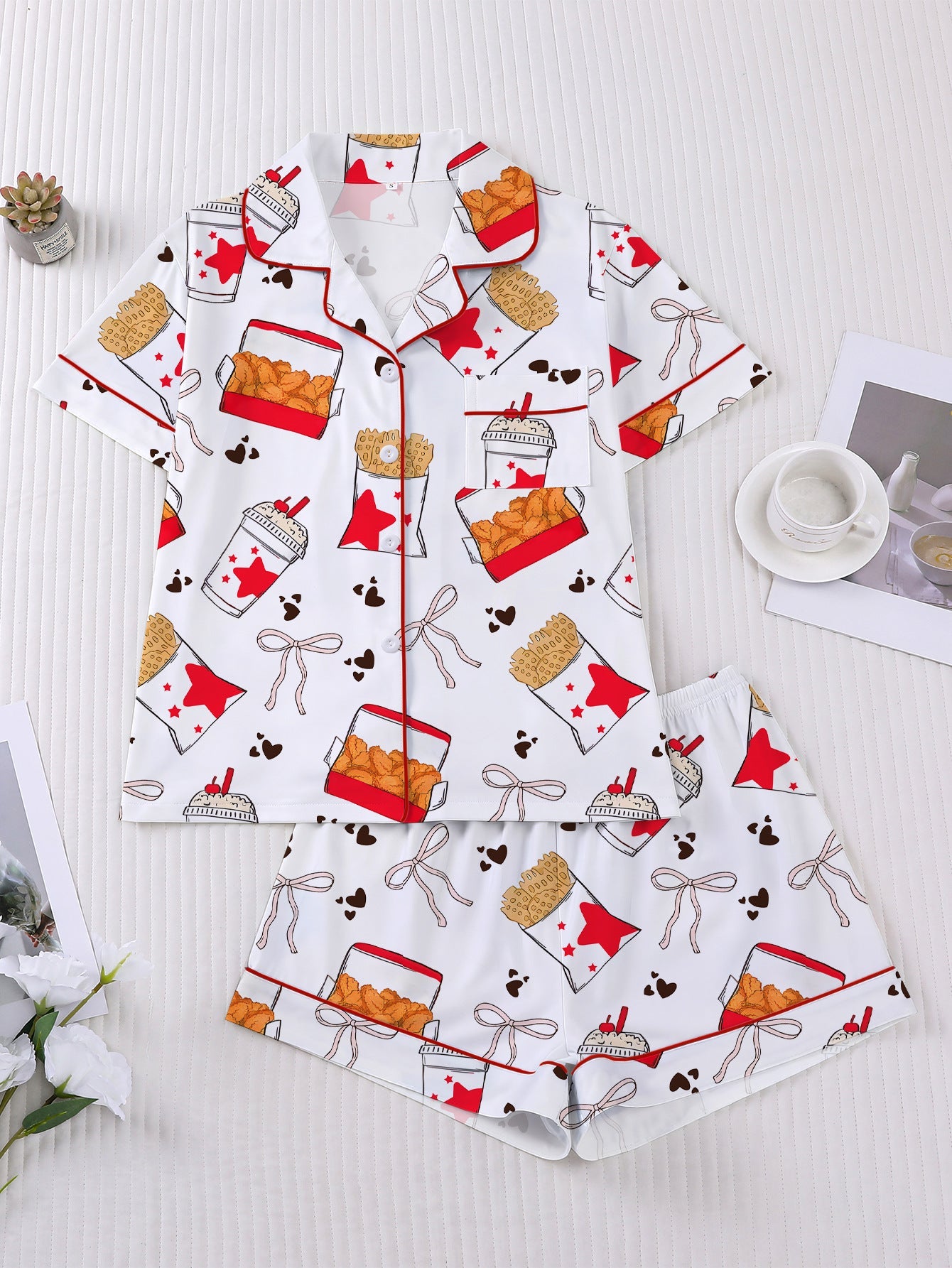 Bring the flavor to bedtime with our Fast Food Chicken Print Pajama Set! Featuring a playful fried chicken pattern and soft fabric, this matching set keeps comfort on the menu all night long. Perfect for cozy lounging, movie nights, and gifting your favorite foodie.