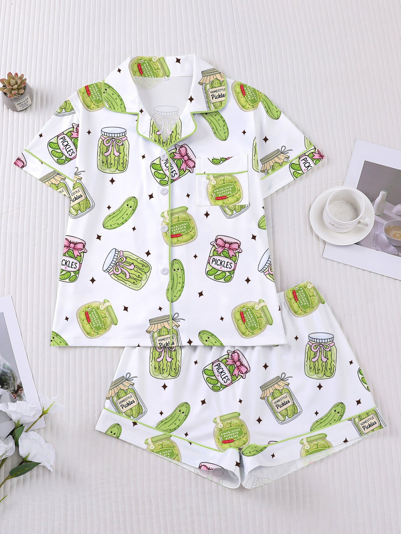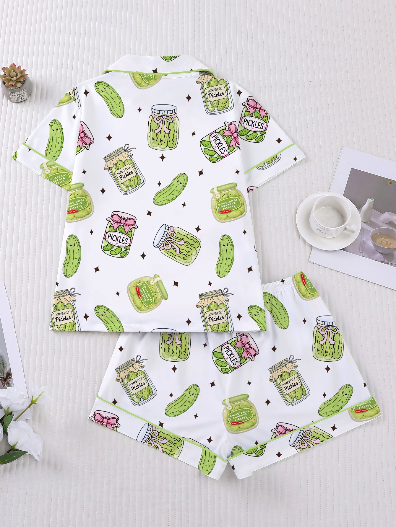 Add a playful twist to your sleepwear with our Pickle Print Pajama Set! Featuring a short-sleeve button top and matching elastic waist shorts, this lightweight set keeps you comfy for warm nights, movie marathons, and lazy weekend lounging. The bold pickle print adds a fun and quirky edge—perfect for anyone who loves cozy pajamas with personality.