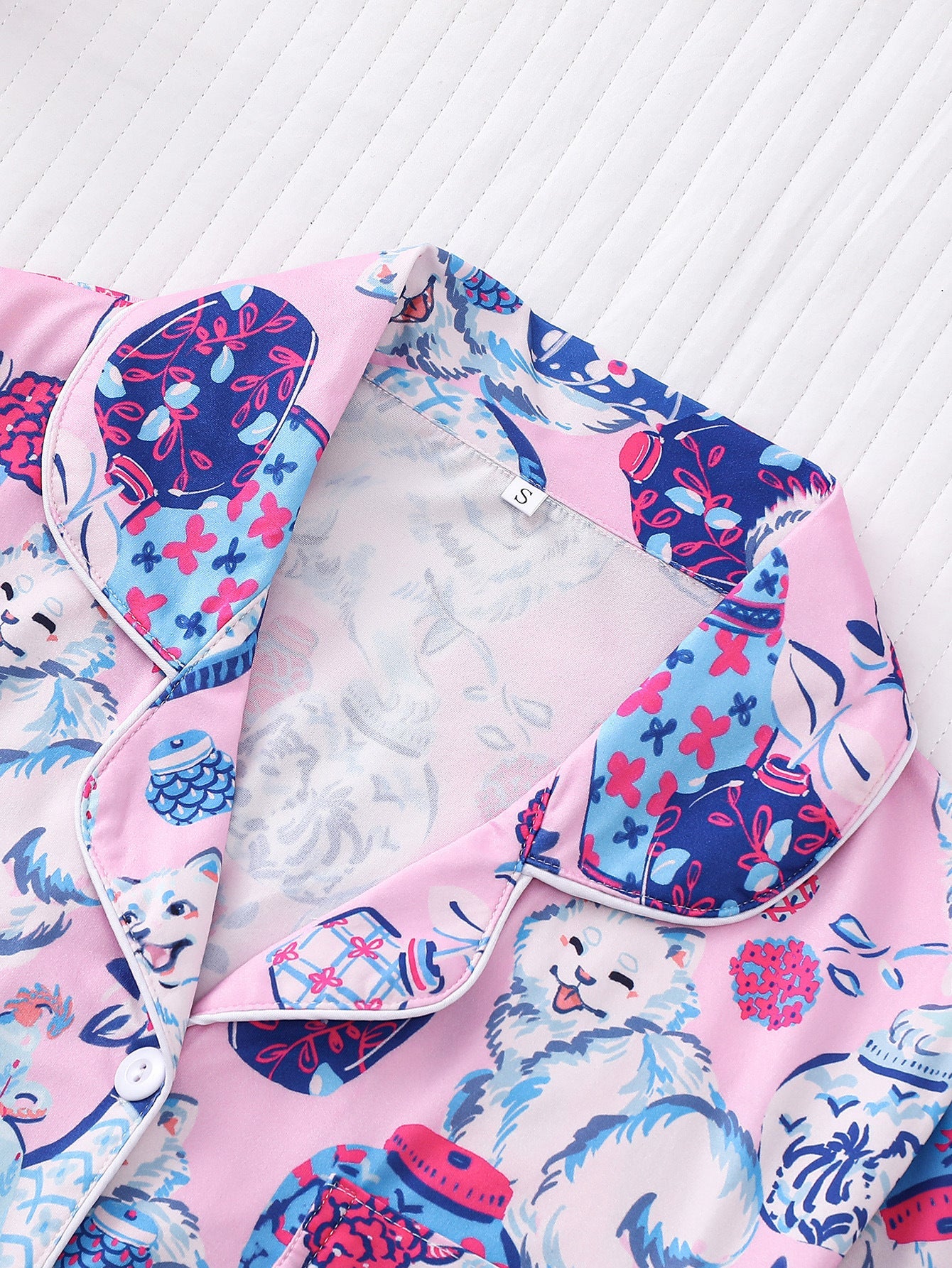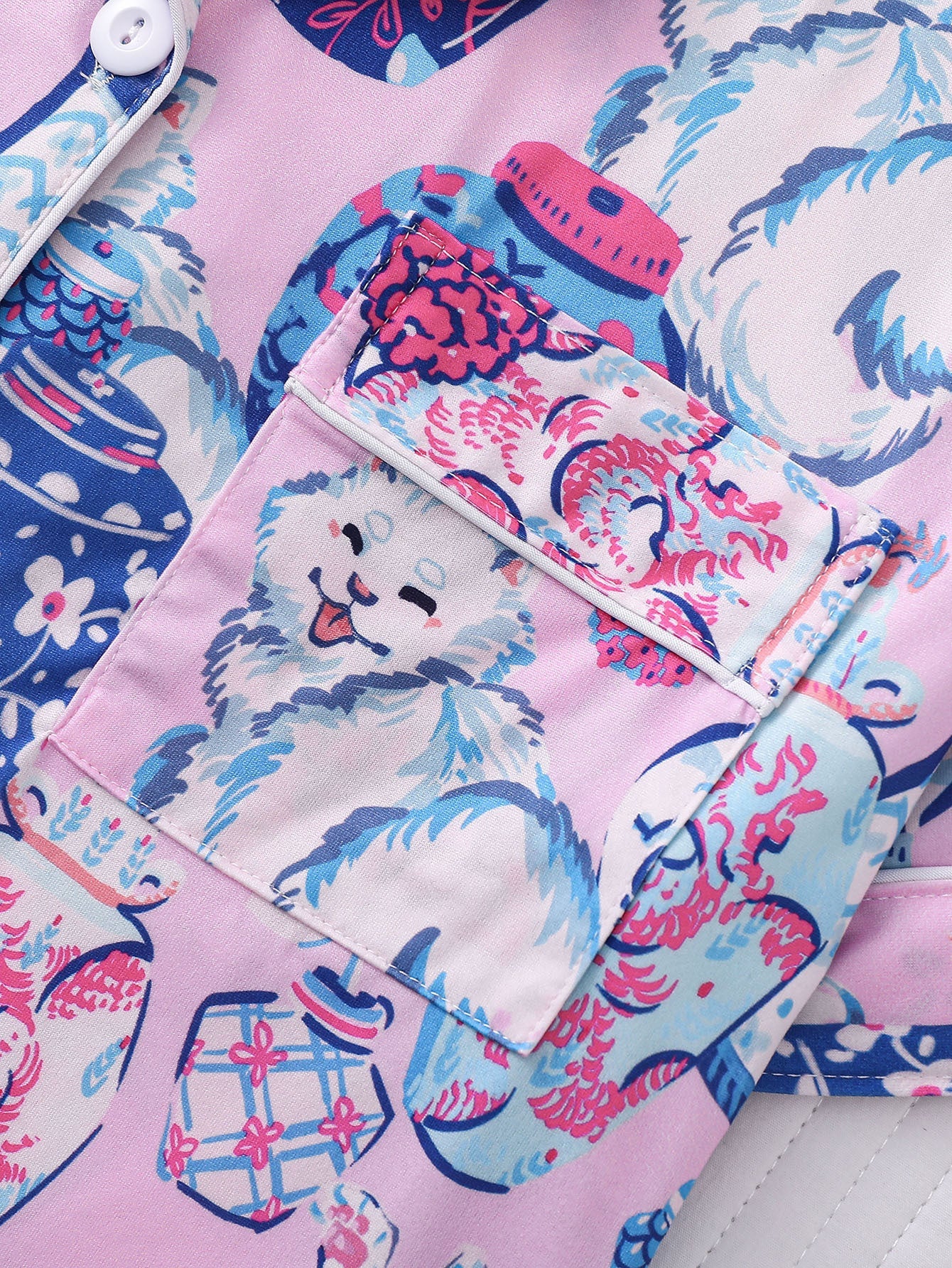 Soft, playful, and beautifully printed — our Pink Porcelain Cat Pajama Set brings cozy charm to your sleepwear rotation. Featuring a short-sleeve button top and matching elastic waist shorts, this lightweight set combines pastel tones with chinoiserie-inspired vases, florals, and adorable cats. Perfect for warm nights, weekend lounging, or gifting to the cat lover in your life.