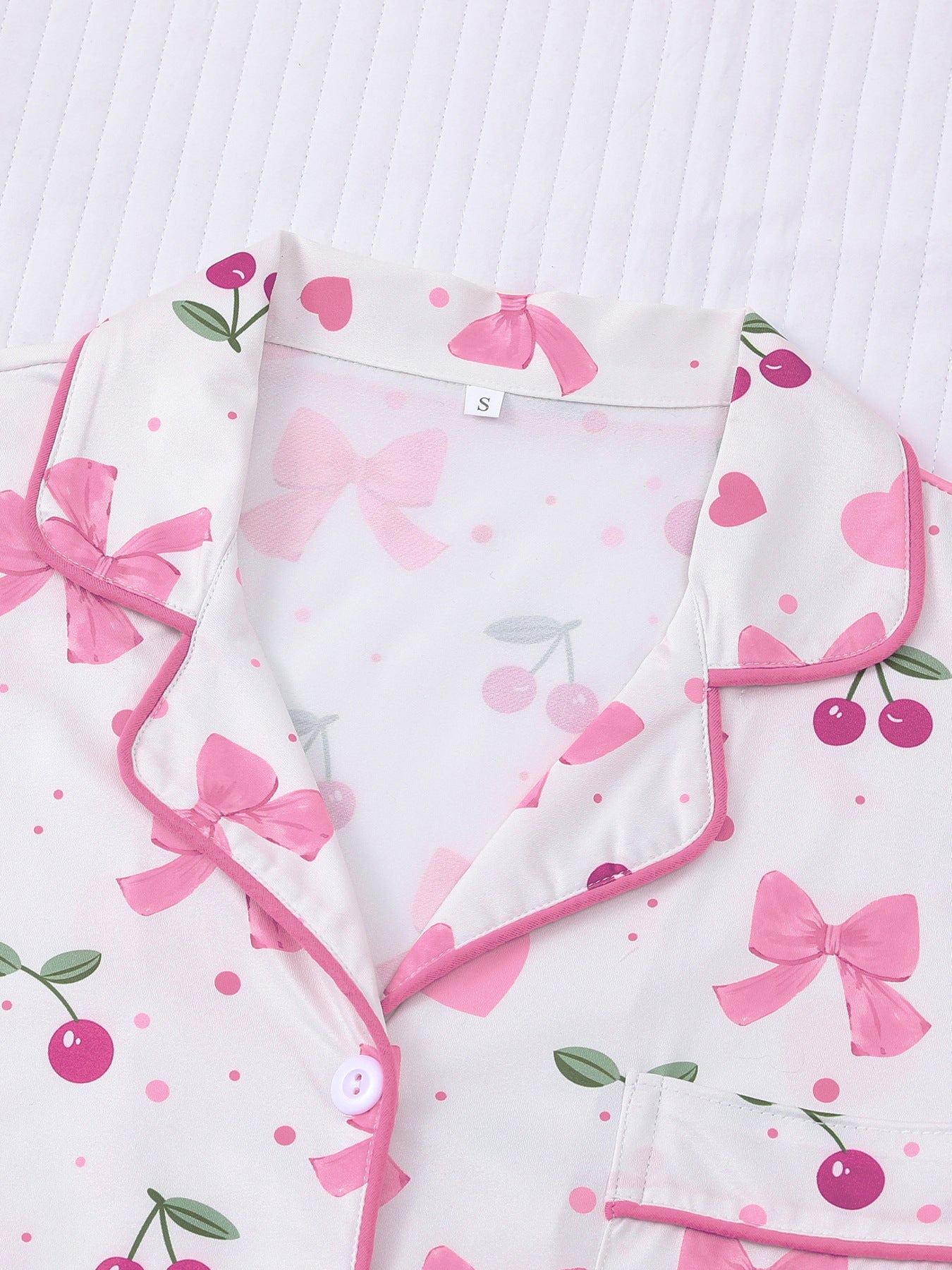 This women’s bow and cherry print pajama set is perfect for lounging, sleeping, Valentine’s Day, Galentine’s nights, or gifting someone special. Cute, comfortable, and full of personality, it’s a must-have for cozy nights in.