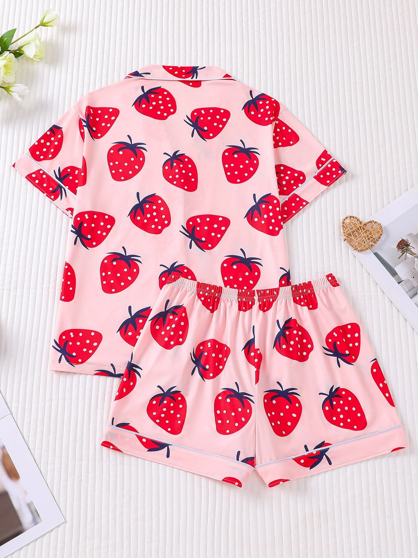 Slip into charming comfort with our Strawberry Print Pajama Set, designed for cozy nights and feel-good lounging. Featuring an adorable strawberry-inspired print, this pajama set adds a playful pop of color and feminine flair to your sleepwear collection. The soft, breathable fabric keeps you comfortable all night long, making it perfect for relaxing evenings and slow mornings.