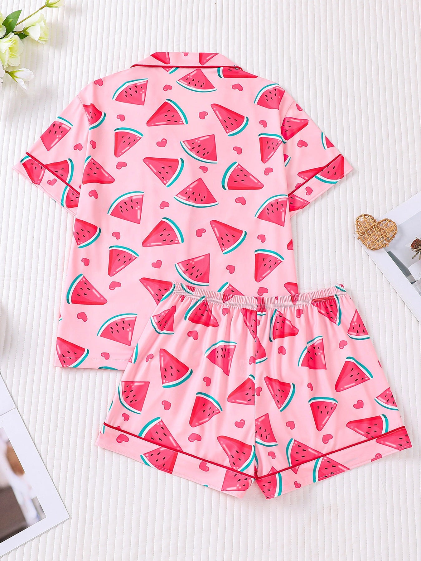 Sleep sweet and stay comfy in our Watermelon Print Pajama Set, a playful, feel-good style made for cozy nights and sunny mornings. Featuring a fun watermelon-inspired print, this pajama set brings a fresh pop of color and personality to your sleepwear collection. The soft, breathable fabric keeps you comfortable all night long, making it perfect for warm-weather lounging and sleeping.